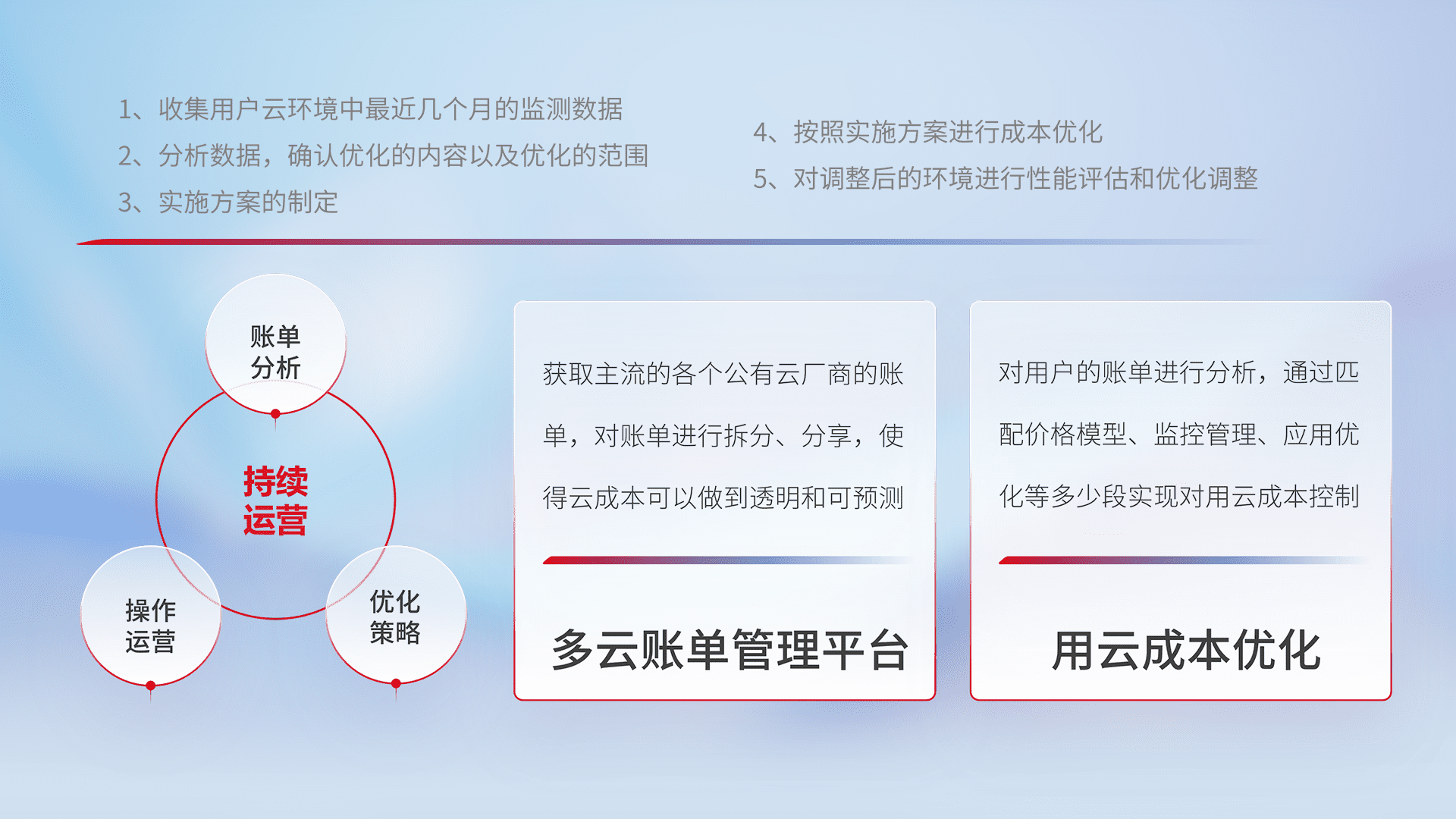 通过多云纳管,,,,以统一的资源数据模型把客户的云资源进行抽象和封装,,进而实现对多云资源的统一操作,,保障云资源管理的可靠性、、、、稳定性与可用性。。量身定制化运维内容,,,,配置、、开发运维、、、补丁管理、、、备份、、、、监控、、认证和访问管理、、、、审计和日常巡检等,,,保障在用云过程中的可靠度,,稳定度以及高可用率。。。。